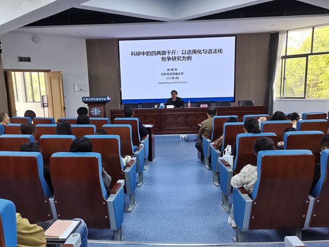 向明友教授以“科研中的四两拨千斤:以语用化与语法化纷争研究为例”为主题,从研究目的、基本概念、纷争所在、sort of案例、问题的解决、结论与启示六个方面发表了精彩的讲座。向教授首先介绍了探究语用化与语法化之争的研究目的,指出自语用化概念提出以来,其与语法化之间的关系问题一直备受争议,学术界对此莫衷一是,因此有必要深入探讨两者之间的本质区别。随后,向教授用通俗易懂的方式分别阐释了语法化和语用化的基本概念,表明语法化是指某一词汇项或结构的实词意义在某种语言环境里逐步消失,并代之以语法功能的演变过程;而语用化是在特定语境中,某一词汇和语法形式的命题意逐渐消失,并代之以作用于话语层面的篇章构建义或元交际性互动的功能。在谈到语用化与语法化之纠纷时,向教授指出,两者纷争的核心在于究竟是语用化还是语法化促成语用标记语的演变,以及是否应将语用化归入语法化亚范畴等问题上,并通过列举Traugott、Aijmer等学者的观点为同学们展示了历史上语法化与语用化之间的两次争论。