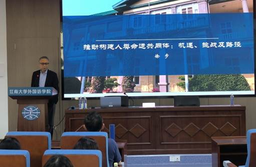 作了一场题为“推动构建人类命运共同体:机遇、挑战及路径”的学术讲座。讲座由学院院长方文开主持,学院师生50余人参加了讲座。