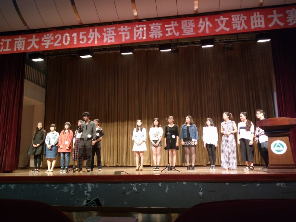 2015外语节闭幕式暨外文歌曲大赛在南区学生活动中心隆重举行。出席本次闭幕式的领导、嘉宾有校教务处副处长杨延、校学工部副处长张海峰、校团委副书记魏珍吉、研究生院副院长谢卫忠、91社区
