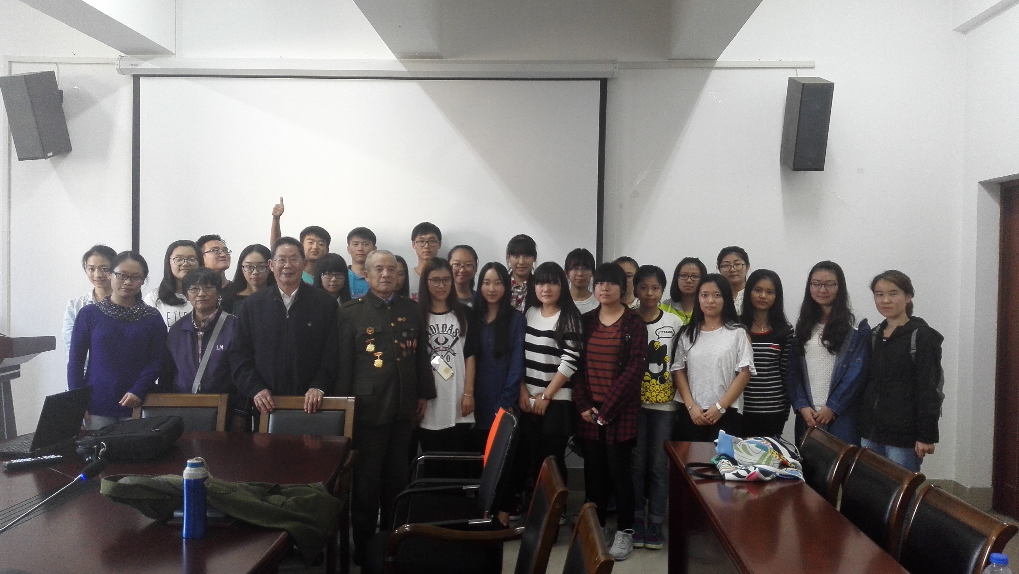 2015116日下午,91社区 在文科楼A349举行了主题为“走近抗战老兵,悟爱国主义精神”的党团共建座谈会。91社区 党团共建结对支部——社桥党支部书记厉光裕、支委杨丽娟、新四军抗战老兵许德山、英语1403团支部全体成员参加了此次座谈会。座谈会由分团委书记陈昀主持。