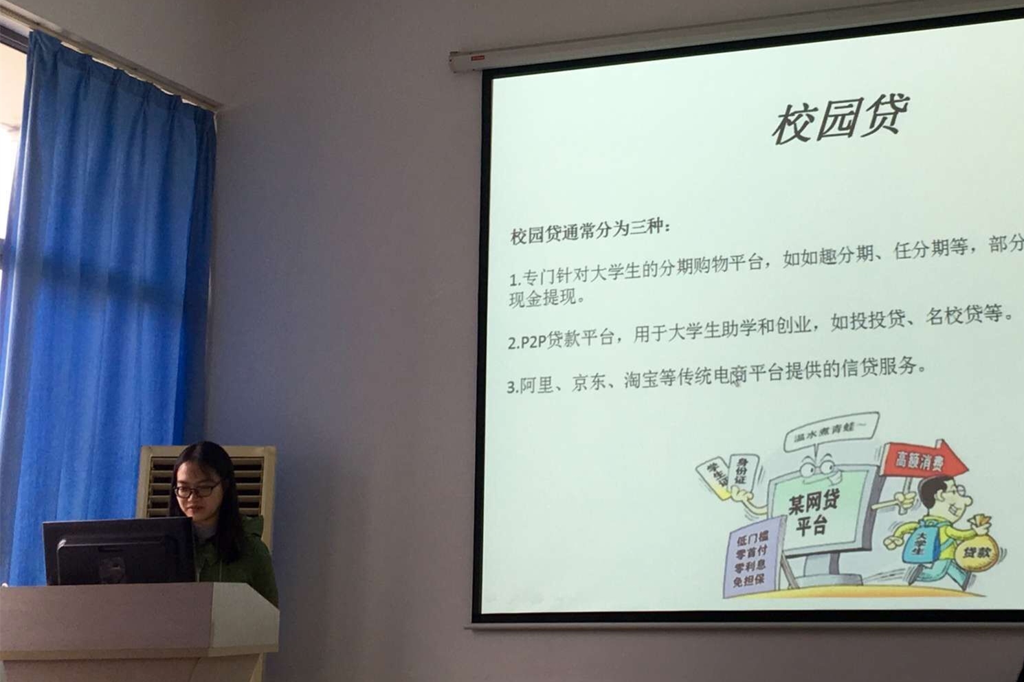 英语1506班不仅以各宿舍为单位排查是否有同学涉足网贷组织,还配合学校、学院要求,为让同学们了解非法网贷,金融诈骗的危害,召开了主题班会。会上,班主任和同学们用PPT等形式,讨论、分享了自己对于网贷危害的认识。
