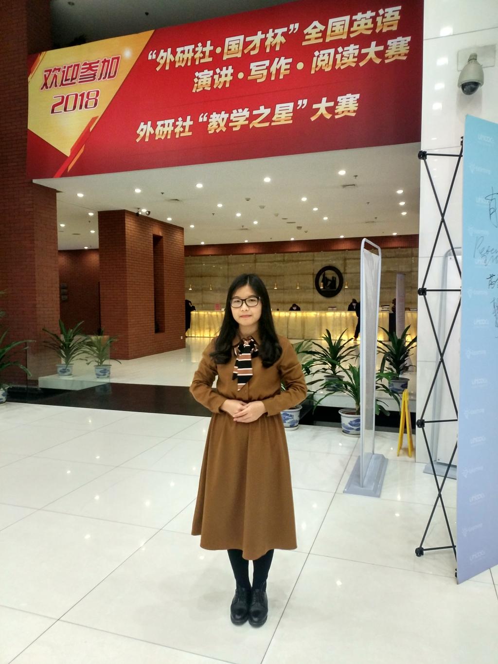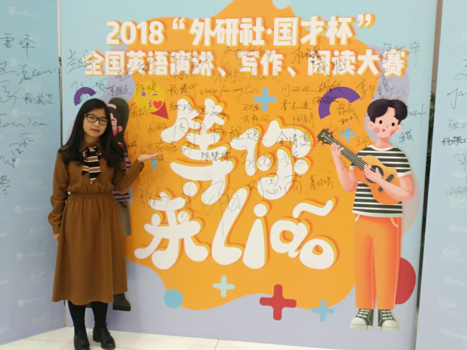英语1605班戚淼同学从3443名中国选手、44名外籍选手中脱颖而出,成功晋级前90强,获得全国总决赛资格,并在国赛赛场上获得了全国三等奖!