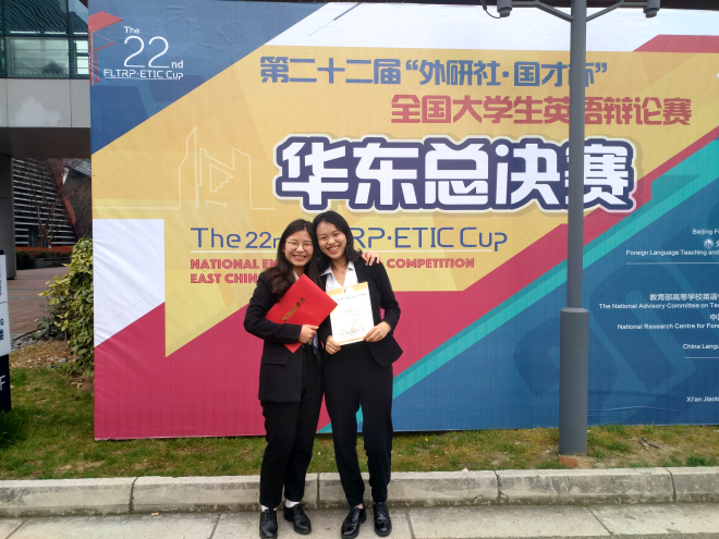 英语专业1605班学生田怡凡和戚淼代表我校参加比赛,最终排名第16,成功晋级全国赛。