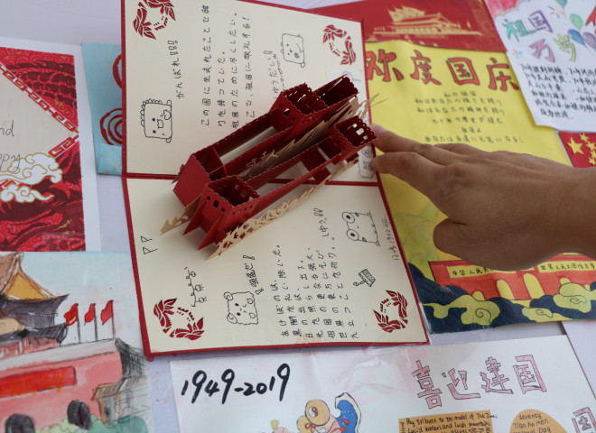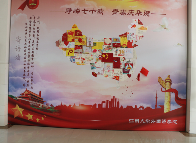 学生会宣传部的同学将收集的收卡制作寄语墙。中国的地图像一只昂首傲立雄鸡,“一唱雄鸡天下白”,雄鸡报晓送走了长夜,迎来了曙光,新中国七十年的风雨历程和伟大成就激发青年学生爱国之情。为表达对祖国热爱,外院学子将收集的寄语卡片制作成祖国地图,以这幅崭新的雄鸡地图寓意着中华民族的伟大复兴不可阻挡。