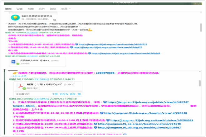 开展“2020春季空中双选会”既是促对接、稳就业的有力举措,也是打通学生就业渠道的暖心之举。学院通过在招就处网站、学院公众号招聘专栏及时发布招聘信息,实现了“就业服务不断线、网上招聘不下线”的目标。为了调动学生就业积极性,提高毕业生的就业能力和职业素养,学院邀请英语系18届入职碧桂园管理培训生计划的张颖学姐,通过录制“学姐求职说”视频,为毕业生分享求职经验,助力学生顺利就业。此外,毕业生辅导员杨艳老师前期通过参加就业线上培训会、召开就业主题会议等方式,为学生顺利就业保驾护航。