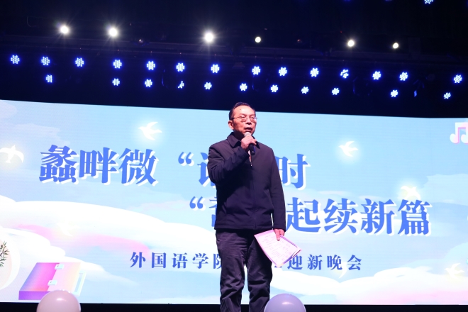 院长方文开为晚会致辞。方文开首先回顾并肯定了本学期学院在文体活动方面取得的成绩,鼓励大家奋发努力,在新的一年再创佳绩。方文开寄语大家:讲好中国故事,外语人重任在肩,各位同学们要主动迎接新时代,新征程,新挑战,新机遇,踔厉奋发,笃行不怠,德智体美劳全面发展,为中华民族的伟大复兴而奋斗!
