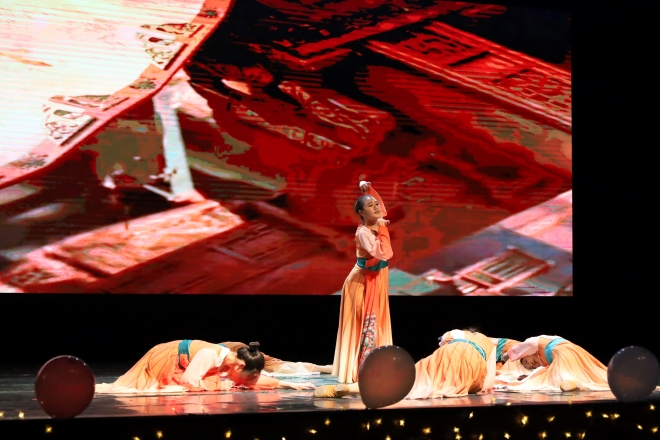 晚会由狂花乐队表演的《言って》开场,气氛热烈,燃爆全场。第一篇章淡墨韵景忆长安:由艺术团带来的民舞《唐印》,舞姿优美,唐韵悠长;器乐《寻你》除了学生的乐器表演,还邀请了91社区