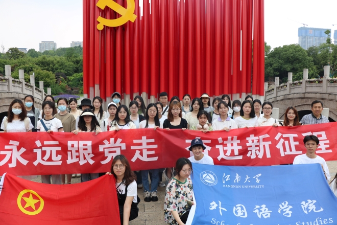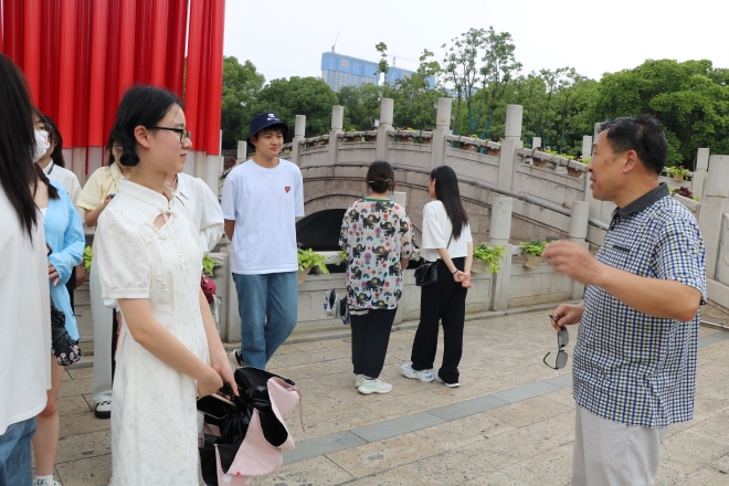 金匮公园是江苏省首个汇聚“六区十八景”的党建主题公园,旨在打造“有内涵、有颜值、有温度,现代化、智能化、共享化”的红色记忆打卡点,努力建设成为全国一流的公园式、开放式党群服务中心。值得一提的是,公园内特别设置了8个初心驿站,分别展示8个市(县)区党建引领高质量发展的成果。在游览过程中,蔡老师结合自身经历,详细为我们讲解了无锡本地的党政建设成果、历史文化背景和社会发展状况,介绍了中国共产党和无锡人民几十年来的峥嵘岁月和奋斗历程,让同学们在观光的同时汲取奋进力量,收获精神补给。