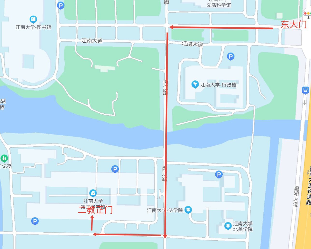 1.考生务必从蠡湖大道1800号东大门进出考点,进入校园后请沿指定线路到达考试区域,东大门距离考试楼约15分钟路程。