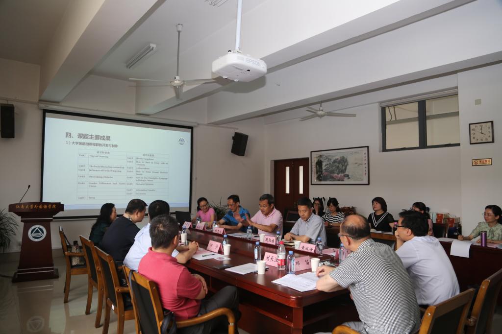 接着,省教育厅蔡华处长提出了重点课题的结题要求。随后,课题鉴定会由专家组组长何宁教授主持,课题负责人王伟炜老师向专家组详细汇报了课题研究的内容,实施的步骤,取得的主要成果,存在的缺陷和不足,并向专家组现场展示了一个微课成品,又就鉴定专家组关切的、有疑问的、拓展开的各类课题问题进行了一一论证与答辩。鉴定专家认真听取汇报,审阅了相关材料,展开了详细的质询,并提出了改进课题后续研究与深化大学英语教学改革的建设性意见。