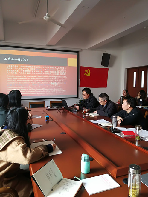 本次政治理论学习,不仅是专业翻译领域的探讨交流会,更是共建支部对十九大精神的再次集中学习。会上师生在充分肯定了报告译文的专业性、准确性和中国特色外,对于学习外语不仅能够传播弘扬中华文化,让世界更多人认同中国特色、认同中国价值,同时使中国走向世界舞台的中央充满了信心,感受到自身肩负着民族和国家赋予的重大历史使命。