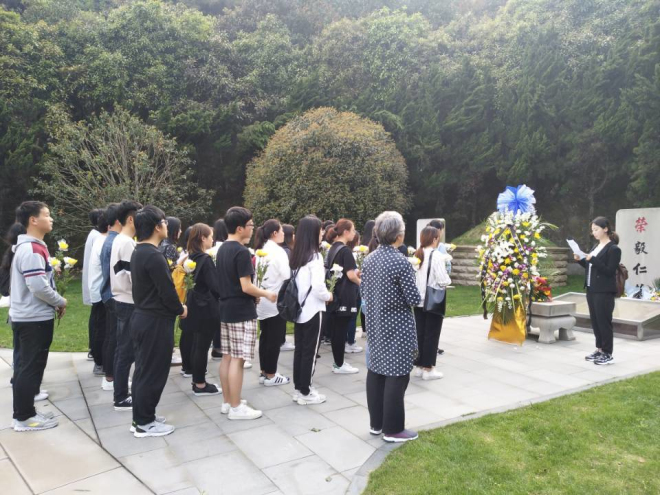 发展的拳拳之心。学生代表日语1501的张林薇同学表达了对荣副主席的丰功伟绩、家乡情结、爱国情怀、崇高品质的追思与敬重。伴随着轻声念出的祭文,在场师生一同追忆那个令人尊敬的灵魂。参加祭扫的同学和老师在静默哀思后绕墓地一周,向墓地献上了鲜花,表达了对荣副主席及夫人的深切哀悼和敬仰之情。