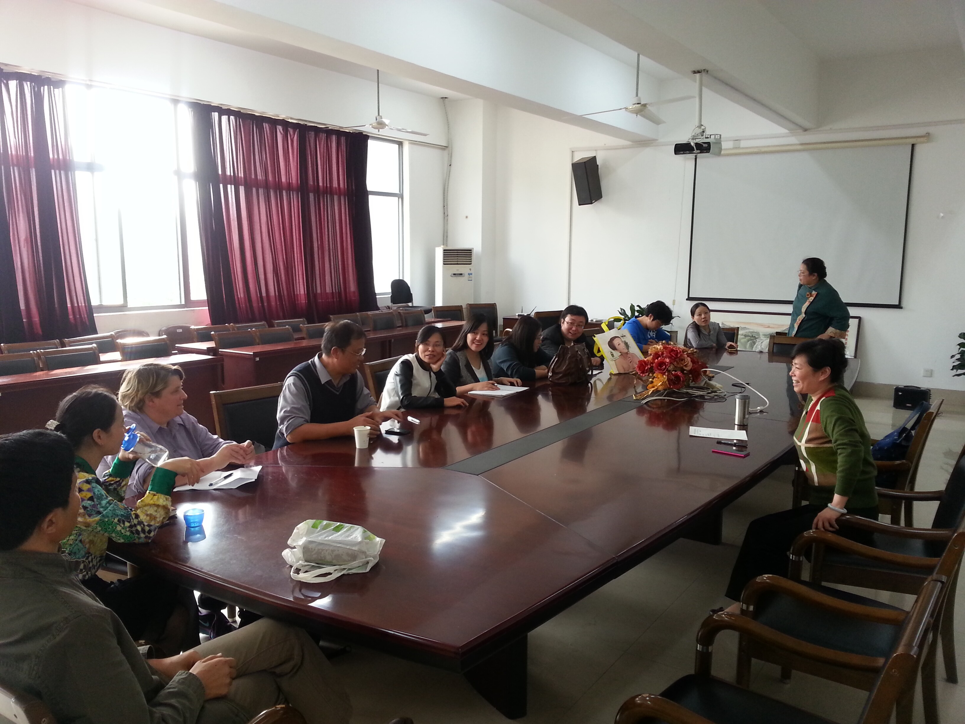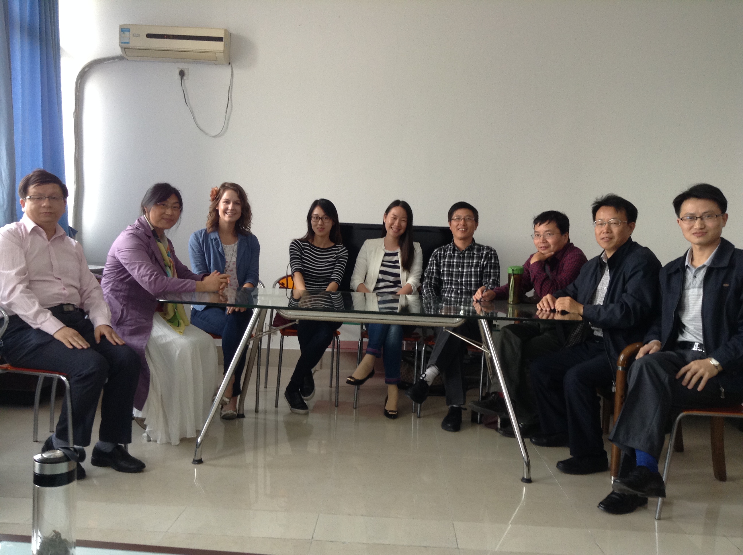 翻译教研创新团队在学院工会活动室举行了首次全英文的交流,交流活动由团队负责人王金安教授主持。首先,王教授代表翻译学科团队对外教Kelli的加入表示了热烈的欢迎,Kelli对个人的求学背景、学术兴趣与教学经历进行了介绍,并和大家分享了在中国的所见所闻。随后,团队成员就中西文化的差异、团队活动的规划与主题、团队研讨的形式与地点、口笔译教学中遇到的问题、项目与成果培育等方面发表了各自的见解。此外,团队成员还进一步表示要多加强联络与沟通,强调要利用Wechat与QQ群等来保持信息互通有无的重要性。整个活动最后在轻松与愉快的氛围中画上了句号。