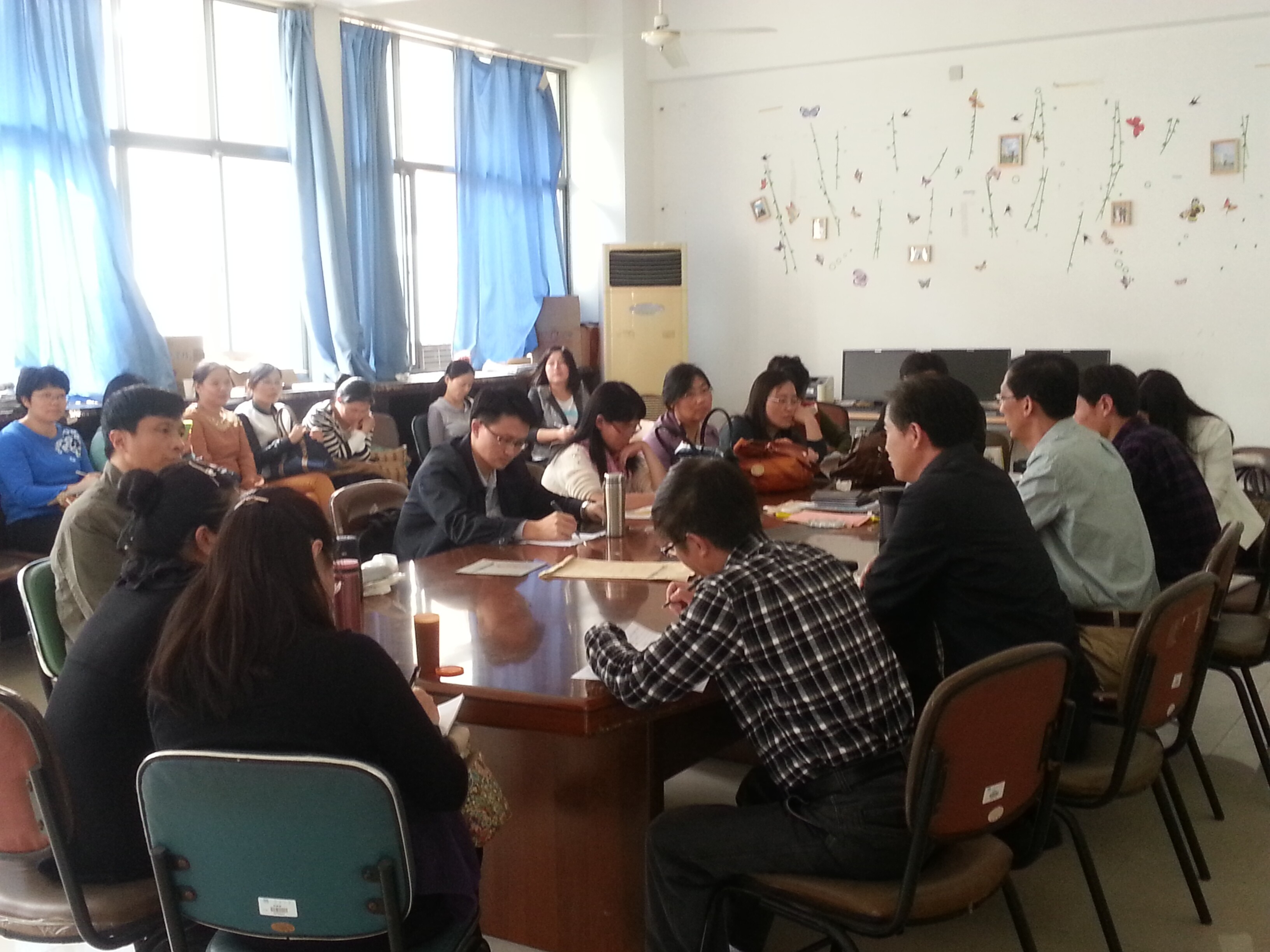 文学文化教研创新团队全体成员在文科楼B309就该团队今后的发展与卓越课程的申报进行了交流与讨论,研讨活动由荆兴梅老师主持。团队成员首先讨论了文学和文化方向组卓越课程的申报事宜,鼓励符合申报条件的课程积极申报学校卓越课程。随后,2014国家社科基金项目的获得者荆兴梅博士与张俊萍博士分别介绍了各自项目的开题情况和研究进展。此外,老师们还对文学和文化有关的研究热点如中西方宗教与文化的异同;教风学风与课堂管理;文化与文学人品的塑造;社会性别和女性主体的建构等进行了轻松而热烈的讨论。