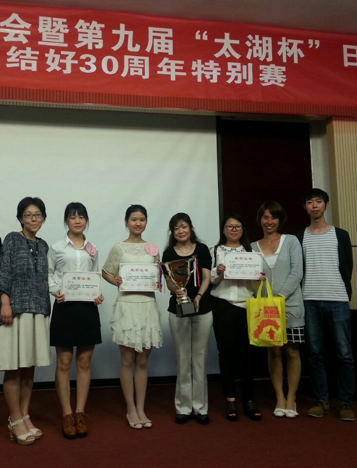 在此次演讲比赛中我校日语系13级学生王卉怡表现突出,以地道的日语发音及提问环节的流畅表达获得评委们的认可,荣获“本科组特等奖”及“评委特别奖第一名”,并将于今年11月份作为无锡青年代表去日本相模原市参加中日文化交流。此外罗小丽和陈静怡同学均凭流利的演说和出色的表现荣获“本科组一等奖”。中西由美子、西川明子、藤田美奈子三位日籍老师荣获优秀指导老师特别奖。