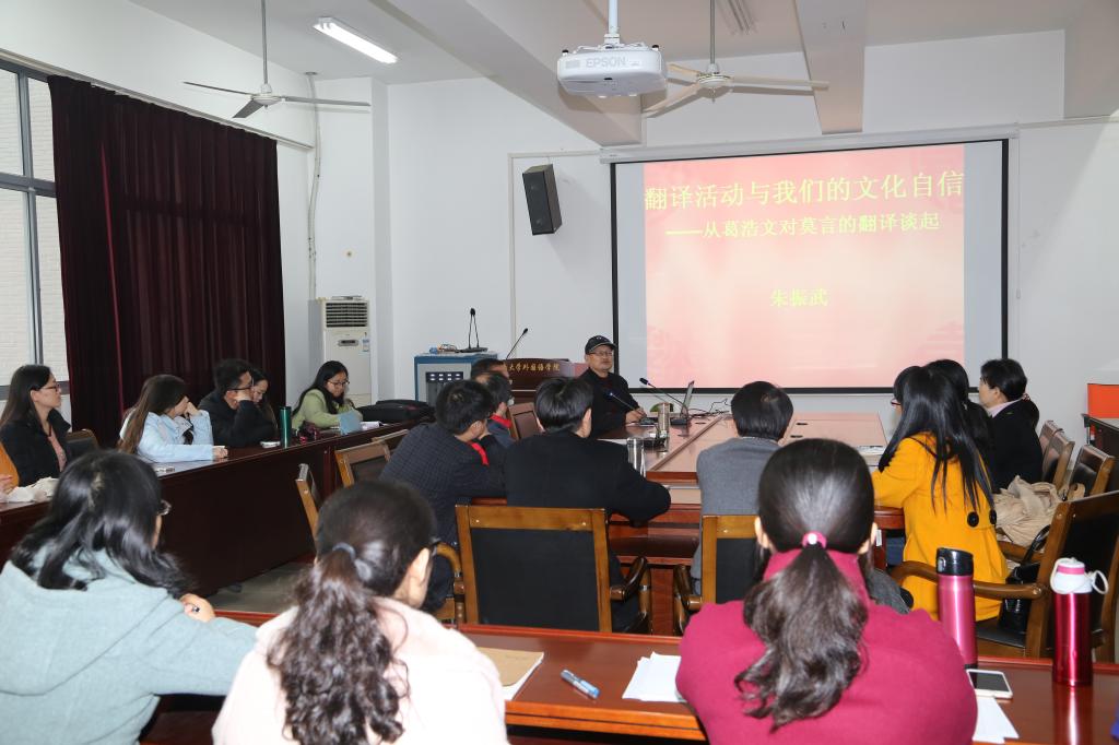 朱教授从事外国文学及翻译研究多年,建树颇丰。一开场,朱教授就结合自己重庆开会的经历,风趣幽默地引导在座师生对莫言获奖中葛浩文所扮演的角色进行讨论。朱教授对我国诺贝尔文学奖得主莫言作品译本研究中出现的集中批评葛浩文“误译”现象发表了自己中肯的见解,并深入剖析了一些误解批评背后潜藏的诸如文化不自信的问题。朱教授强调,葛氏的英译与原文信息有所偏离的信息看似不少,但有些偏离实为译者出于接受的考虑对原文本做出的创造性重构。朱教授还介绍了几个常见的译介活动中认同缺失的例子,比如远东、近东的译法其实是沿袭了英国对其他地区的位置称谓而非以中国自己为参考坐标,这也展现了我们很多翻译活动中缺乏文化自觉的心理。另外,朱教授就怎样对待翻译活动尤其是文学翻译,怎样对待翻译中的错与讹等问题进行了深入探讨,对如何引进文学翻译也发表了自己的心得,如“读者优先”,“文化平等”等翻译思想。最后,朱教授回答了师生提出的问题,说明了文章写得多写得快的秘诀—勤快读,勤快写,勤快学习。