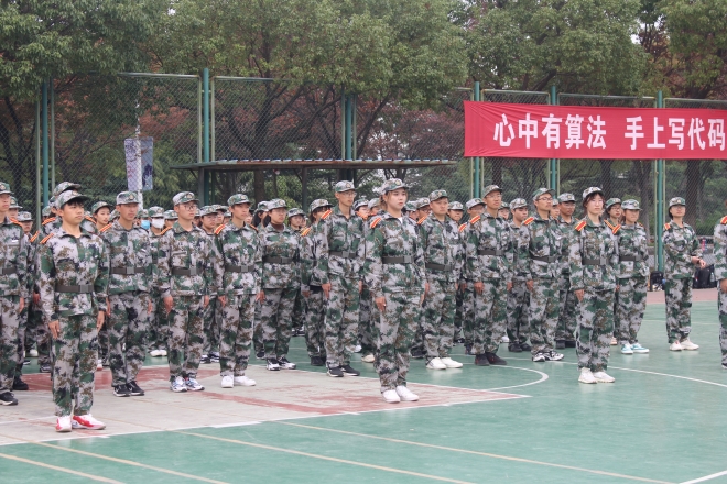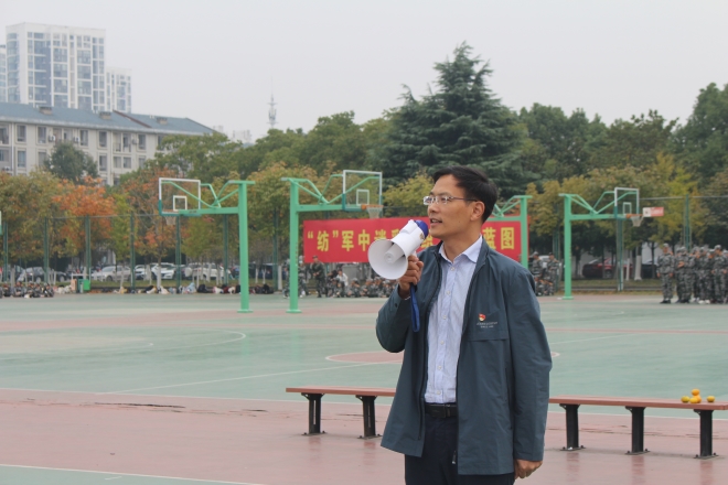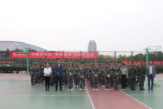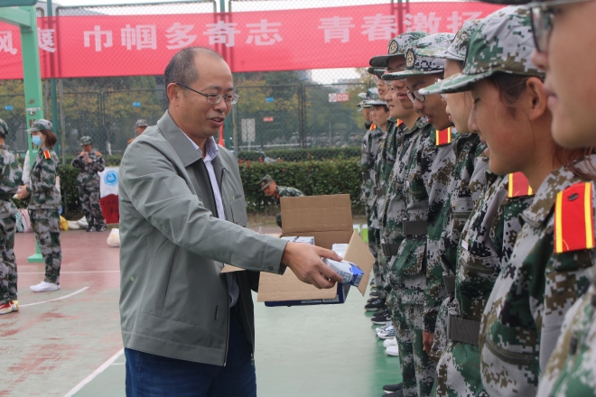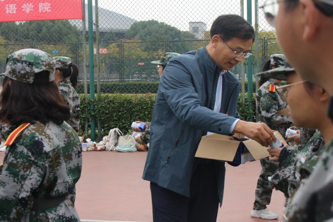 党委书记史志洪、党委副书记刘伯贤、分团委书记陆芳、带训辅导员顾海星来到军训场地,了解大一新生军训情况,亲切慰问并现场检阅了同学们的训练成果。