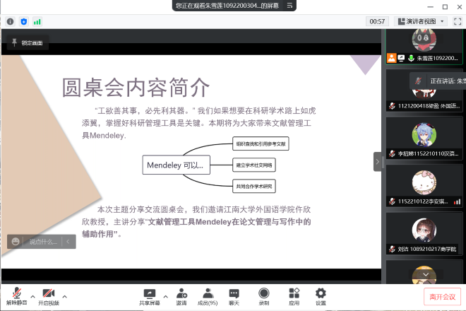 本次圆桌会中,仵欣欣教授向同学们分享使用Mendeley的经验,正如“工欲善其事,必先利其器”,同学们学习并掌握Mendeley后,将有利于日后的文献组织查找以及引用等方面的工作。相信通过此次圆桌交流会,同学们对Mendeley的使用有了更全面的理解!