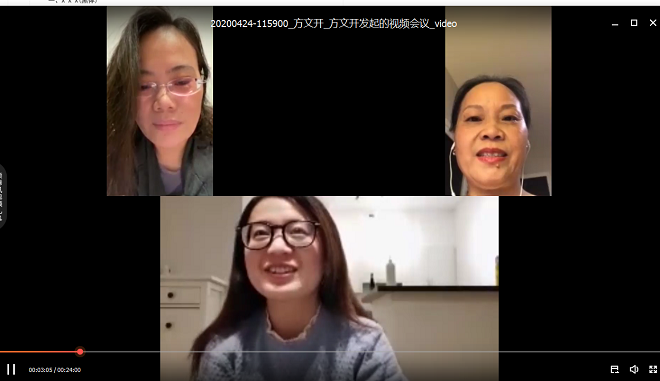 病毒自2020年春节前后在以湖北为重点区域的国内流行,目前又在世界各国肆虐。当国内情况渐有好转,学校抗疫与返校工作进行的同时,身处异国的同事也成为学院师生的牵挂。学院安排了跨越三大洲四个国家的视频通话,表达对他们的问候。美国UC Davis孔子学院的李健雪院长、仇亦倩老师、邢嘉锋老师、吴飒老师,还有在布鲁塞尔中国驻欧盟使团教育文化处工作的刘琦老师,随任于加拿大多伦多的外交官夫人刘燕老师,青年教师郑赛芬共七位老师分别谈了各自的工作和生活情况,面临的主要问题是对所在地区疫情防控形势不明,回国机票难买等。