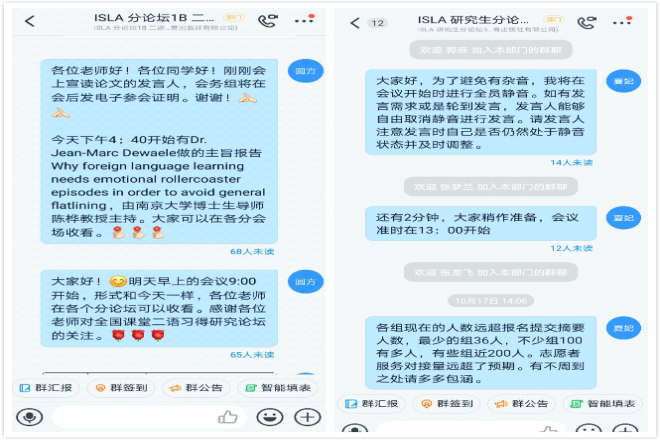 会议正式开始前,每位志愿者在群内发布当天会议流程、主讲人以及主讲题目;会议正式开始时,由志愿者发起线上会议,辅助主持老师控制会议进程;会议期间,志愿者们及时回复群内各位研究学者的消息,为他们提供帮助,邀请未能进入直播的参会者入群。