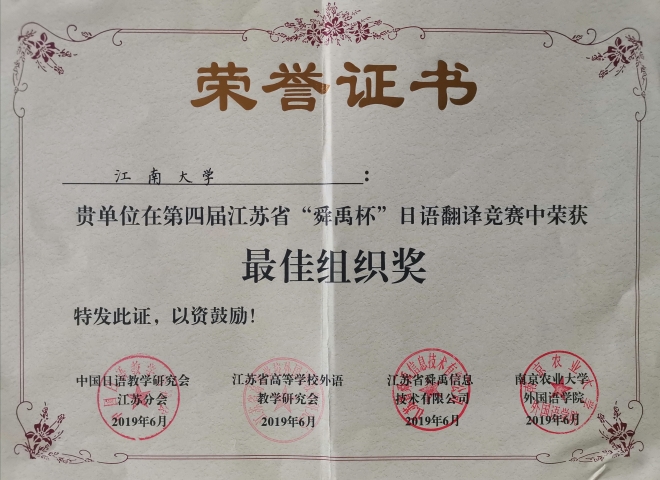 据悉,第四届江苏省“舜禹杯”日语翻译竞赛于2019年1月启动,在控制稿件数量的前提下,3月底截稿时共收到江苏省内26所高校和省外19所高校寄来参赛译文共计409篇,其中日译汉303篇,汉译日106篇,参赛者均是中文为母语的日语专业在校大学生或研究生。4月份经过翻译界专家及评委的匿名评审,共评选出入围稿件日译汉30篇、汉译日10篇。6月1日对入围同学进行现场加试,在紧张的专家现场评审之后,综合初赛成绩,评选出汉译日、日译汉的各级奖项及优秀组织奖。由崔明姬老师带队,91社区