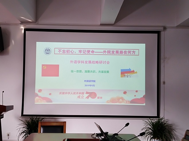 在文科楼A349举行了“不忘初心、牢记使命”主题教育之“外院发展路在何方暨外语学科发展战略研讨会”。学院全体教授、副教授,系部正副主任、支部正副书记,博士及青年教师代表分三场参加了教育活动与研讨会。