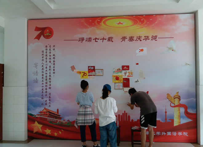 学生会宣传部的同学将收集的收卡制作寄语墙。中国的地图像一只昂首傲立雄鸡,“一唱雄鸡天下白”,雄鸡报晓送走了长夜,迎来了曙光,中华人民共和国成立七十周年的风雨历程和伟大成就激发青年学生爱国之情。为表达对祖国热爱,外院学子将收集的寄语卡片制作成祖国地图,以这幅崭新的雄鸡地图寓意着中华民族的伟大复兴不可阻挡。