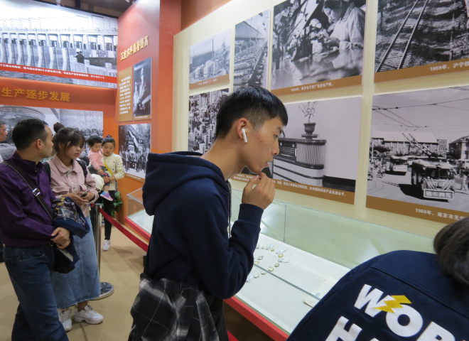 随后步入室内展区,在一幅幅照片、一段段视频、一个个实物场景展示前,每位党员同学驻足仔细观看,充分感受江苏70年来的巨大变化、重大成就。本次成就展通过综合展、地方展和室外展3个展区,综合运用场馆展览、网上展览、挂图展示等形式,展出图片(图表)2000多张,实物、模型、沙盘100多件(套),视频及多媒体展品100多件(套),展列228个先进典型和英雄模范人物(集体)。同学们在题为“太湖明珠 江南盛地”发展变迁的无锡展馆里认真观看、合影留念。