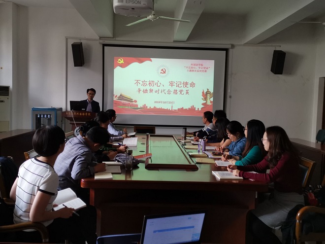 英语系党支部书记彭方针同志以“‘不忘初心、牢记使命’——学习优秀共产党员,做新时代合格的教育者”为题,介绍了焦裕禄、扬善洲、郭明义等优秀共产党员的先进事迹,高度赞扬了他们“鞠躬尽瘁,死而后已”的高尚情操。结合个人学习体会,他说:新时代教育者必须坚守教育报国的初心,坚持正确的政治方向,落实立德树人的根本任务,提升自身综合素养,提高教书育人本领,遵循教育教学规律,为社会主义培养合格的建设者和接班人。