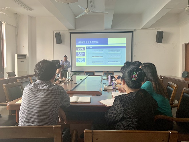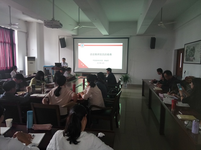 学院党委书记黄城芳以“谈谈教师党员的修养”为题,介绍了李保国、黄大年、钟扬、交大西迁与哈工大“八百壮士”等五个高教战线上的先进个人与集体事迹,让大家深切感受其“教育报国守初心,立德树人担使命”的高尚品质。黄书记号召全体党员教师学习高教战线榜样,争做德能双馨教师,弘扬爱国奋斗精神,做好本职工作,建功立业。
