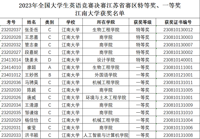 2023年全国大学生英语竞赛决赛(江苏赛区)于6月3日上午9:00 - 11:00在东南大学(四牌楼校区)举行。来自南京大学、东南大学等多所省内高校共744位选手参加了此次比赛,其中A类47人(适用于研究生)、B类68人(适用于英语专业学生)、C类573人(适用于非英语专业本科生)、D类56人(适用于艺术类和高职高专学生)。我校共有15位选手参赛,5人获得特等奖,10人获得一等奖。