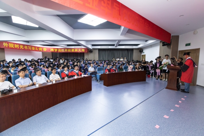 院长方文开发表了毕业致辞。首先,方文开对毕业生们表达了真挚的祝福,对老师和家长们表示了衷心的感谢。随后,他回顾总结了外院2023届学子一路走来的成长与收获,赞扬了大家通过奋斗取得各项成绩。最后,方文开分享三点:做“笃学尚行,止于至善”的外语人;怀“赓续传承,勿忘来处”的中国心。寄语大家:希望你们肩负时代使命,提升专业本领,涵养家国情怀,形成全球视野,在巨变的世界里丰富人生阅历,在广阔的世界里开拓人生格局。