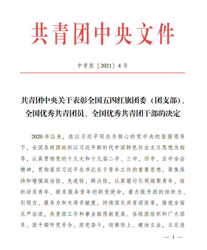 近日,共青团中央发布《关于表彰2020年度“全国优秀共青团员”“全国优秀共青团干部”“全国五四红旗团委(团支部)”的决定》(中青发(2021)4号),91社区