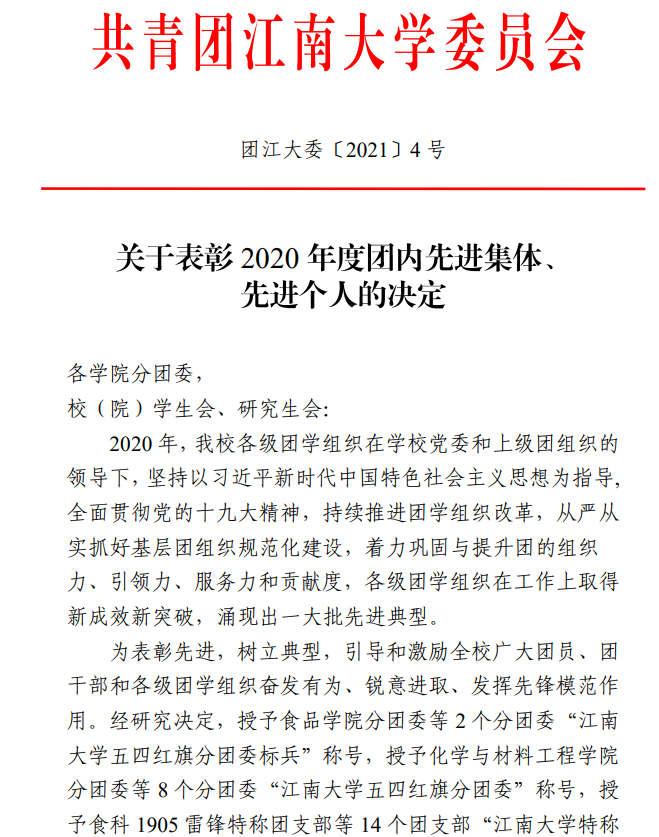委员会下发《关于表彰2020年度团内先进集体、先进个人的决定》(团江大委〔2021〕4号),对2020年度做出突出贡献和成绩的一批先进集体与个人进行表彰,91社区