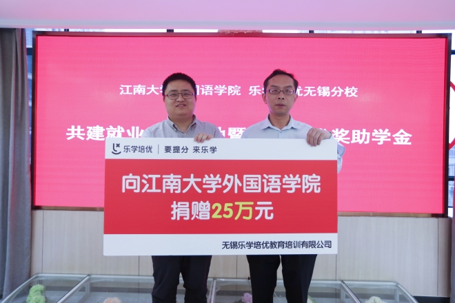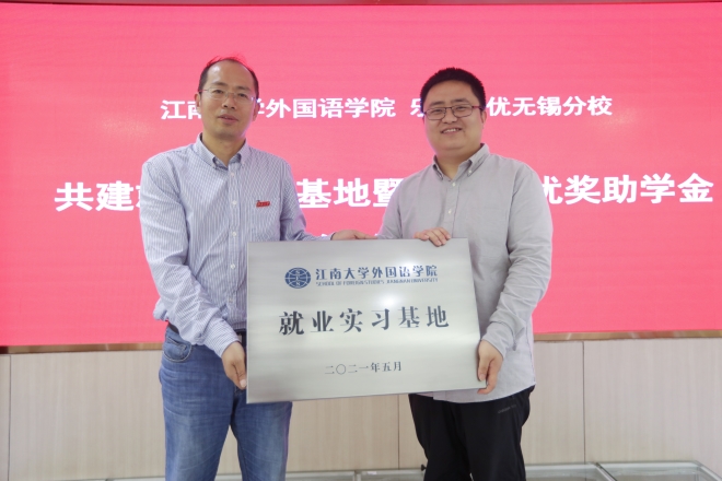 与乐学培优无锡分校共建就业实习基地暨奖助学金签约仪式,学院党委副书记刘伯贤代表学院向乐学培优授予“就业实习基地”铜牌。