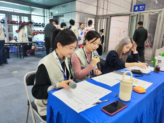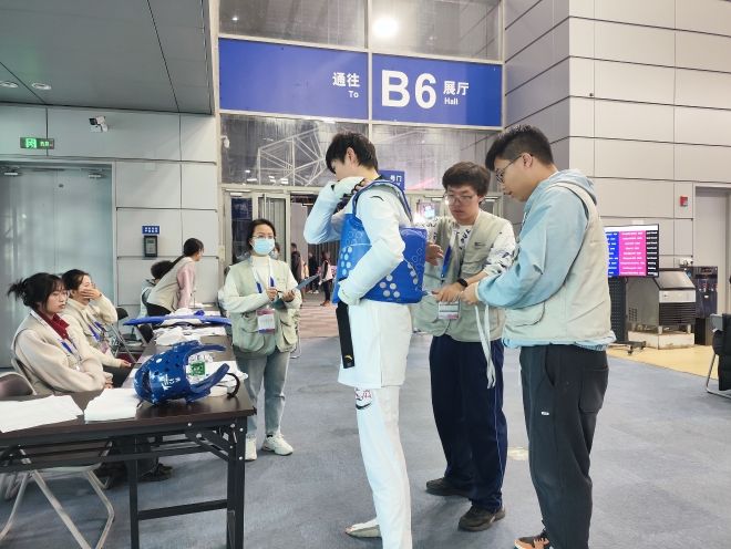 选拔出了184名学生志愿者,投身到赛事的检录播报、护具穿戴、入场引导、计时计分、国际裁判接待等多个岗位中。