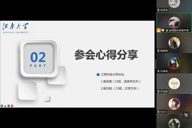 “研途奋进”第十九期活动在腾讯会议线上成功举行。学院全体硕士研究生参与了本次活动。此次活动的主题是“研以共进”外国语言文学研究生学术论坛参会心得分享会,共分为四个环节:谢竞贤副院长通报研三预答辩情况、江苏科技大学论坛参会学生心得分享、扬州大学论坛参会学生心得分享和苏州大学论坛参会学生心得分享。