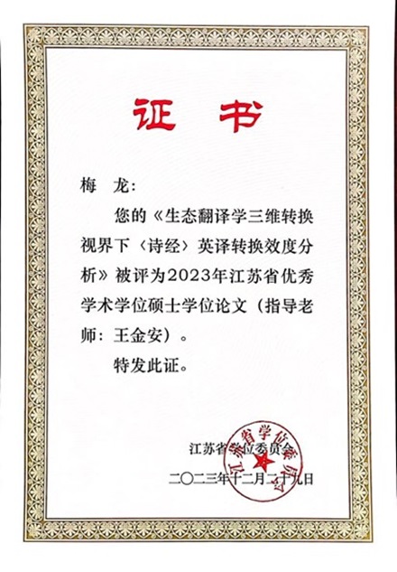 19级硕士研究生梅龙同学完成的硕士学位论文《生态翻译学三维转换视界下<诗经>英译转换效度分析》(指导老师:王金安)获评2023年江苏省优秀学术学位硕士学位论文。