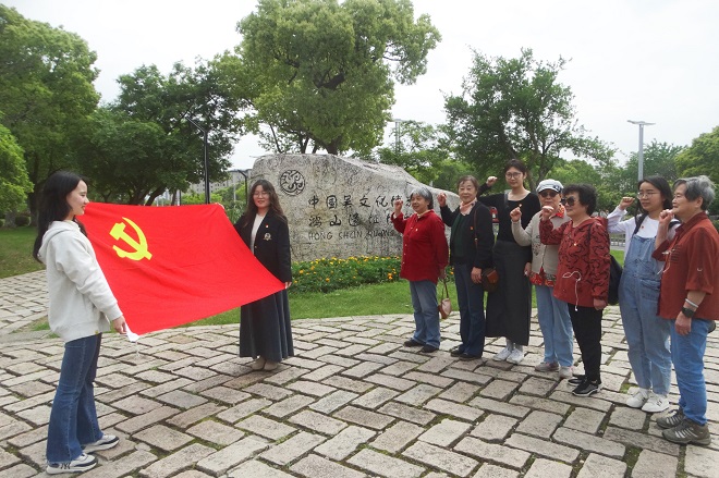 英语本科生党支部党员、雷锋特称团支部、张闻天特称团支部团员,赴无锡泰伯陵以及鸿山遗址博物馆联合开展“老少携手,党团共建”主题实践活动。