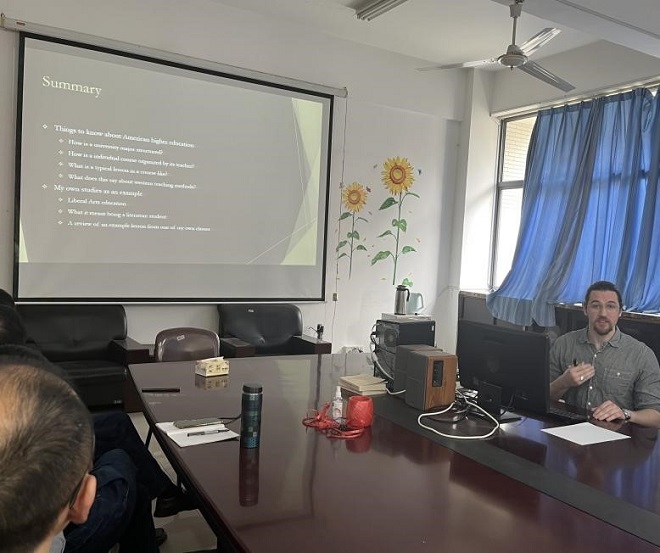 来自美国的Aidan Politte Murphy老师结合自身的学习和教学体验,作了题为“Education in the Liberal Arts”的讲座。首先,作为一名地道的英语专业毕业生,Aidan老师向大家介绍了美国高校文科专业,尤其是他所学的“English Literature”专业的基本课程设置、学分分布;接着,以“Creative Writing”课程为例,从初级、中级和高级三个层次详细介绍美国的文科教师是如何展开课堂讨论教学、课后任务布置与课程考核评价;最后,Aidan老师结合自己在中国近7年的教学经历,作了中美课堂学习过程比较,强调了教与学过程中,教师引导和学生积极主动求知的重要性。