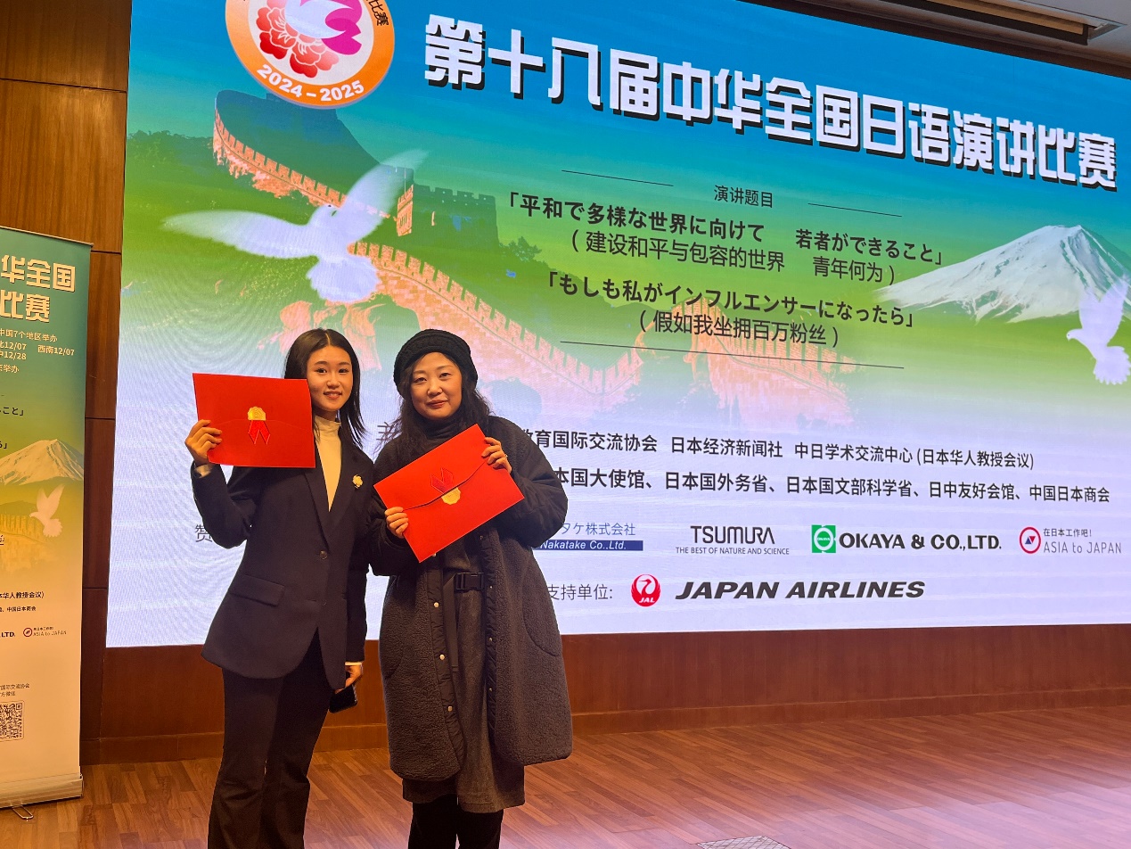 比赛分命题演讲和即席演讲两部分。上午,选手们围绕“建设和平与包容的世界——青年何为”“假如我坐拥百万粉丝”两个主题,开展了限时5分钟的命题演讲。选手们演讲内容贴近生活实际,抒发了真实感悟,用真诚打动观众,以演讲注解心声。下午为限时3分钟的即兴演讲,选手们围绕“人生计划”的主题展开演讲。即兴演讲考验的是选手们的知识储备量以及临场应变能力,比赛更显激烈、紧张。我校选手陈芯蕊以扎实的语言功底和较强的临场应变能力获得二等奖,中西由美子老师、崔明姬老师获优秀指导教师奖。