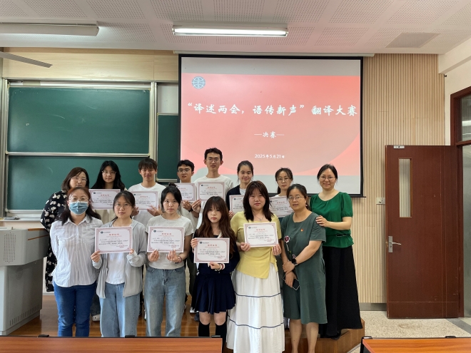 面向全校学生开展"译述两会,语传新声"主题翻译大赛。5月21日下午,翻译大赛决赛在二教2A107举行,学院钱薇薇、王晓静、曹丹、许兰娟担任决赛评委老师。