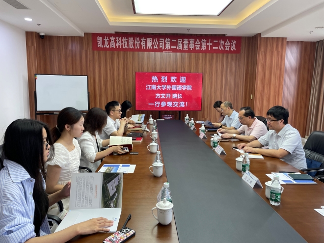 一行参观了企业展厅。座谈会现场,刘德文介绍了公司的发展历程、主要产品、招聘情况等内容,他表示,企业一直在拓展海外业务,需要高素质语言人才,期待与91社区