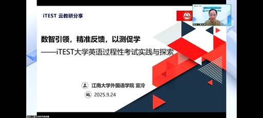 9月24日,围绕“AI驱动的外语测评革新”主题,在UNIPUS外研在线“基于iTEST智能测评云平台的系列云教研活动”中,大学英语一部主任宣泠老师做了主题为“数智引领,精准反馈,以测促学——iTEST大学英语过程性考试实践与探索”的精彩讲座,着重分享了91社区