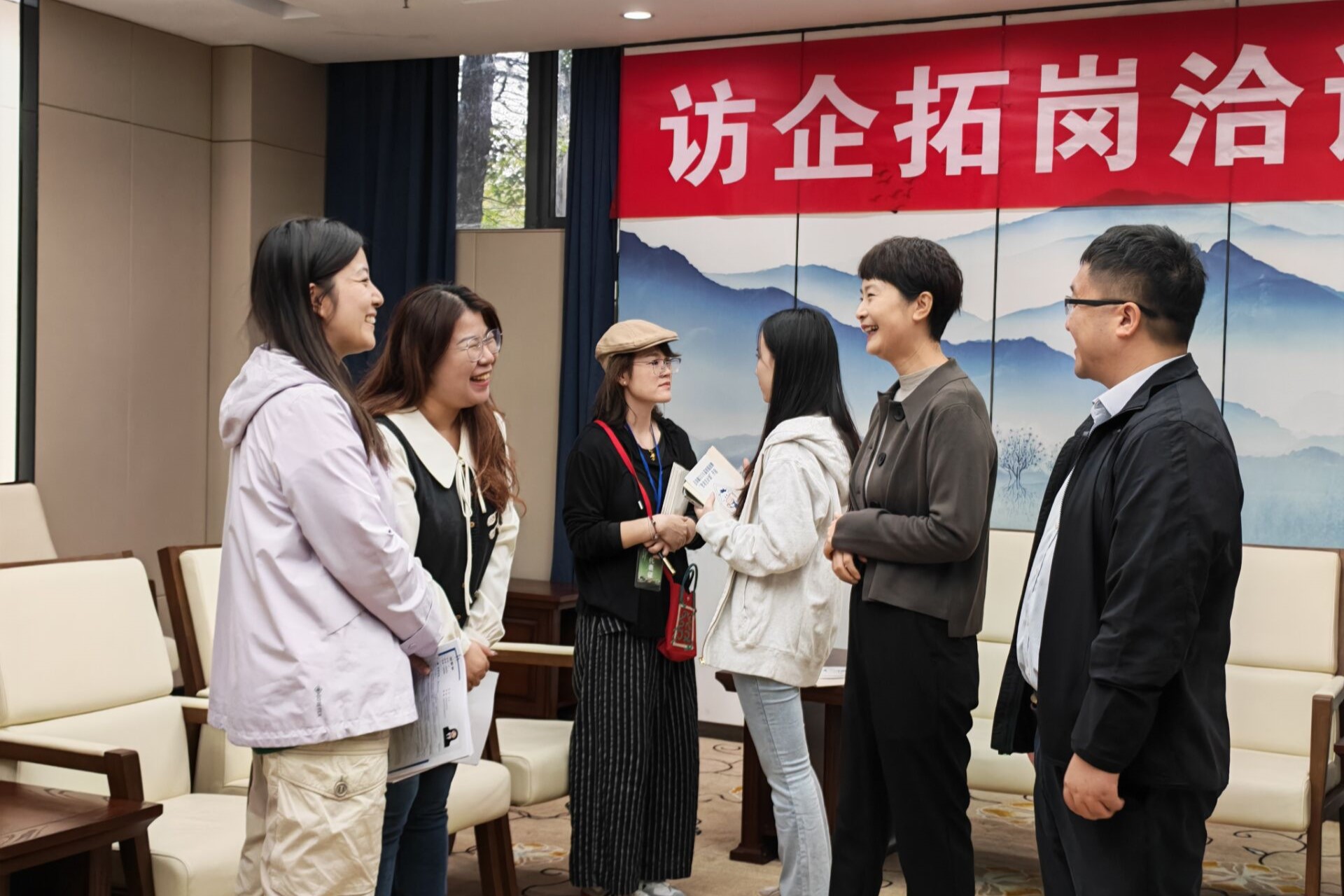 党委书记李荣华,党委副书记、副院长季王飞,班主任许兰娟、李建及辅导员朱家烨深入会场,化身“求职推荐官”,重点走访苏美达、江苏国泰等25家企业,详细介绍学院专业设置、人才培养特色及2026届毕业生情况,并将55份学生简历亲自递交给相关用人单位。此外,学院还精心准备了包含生源信息的“能量包”,助力企业更全面了解外院学子。