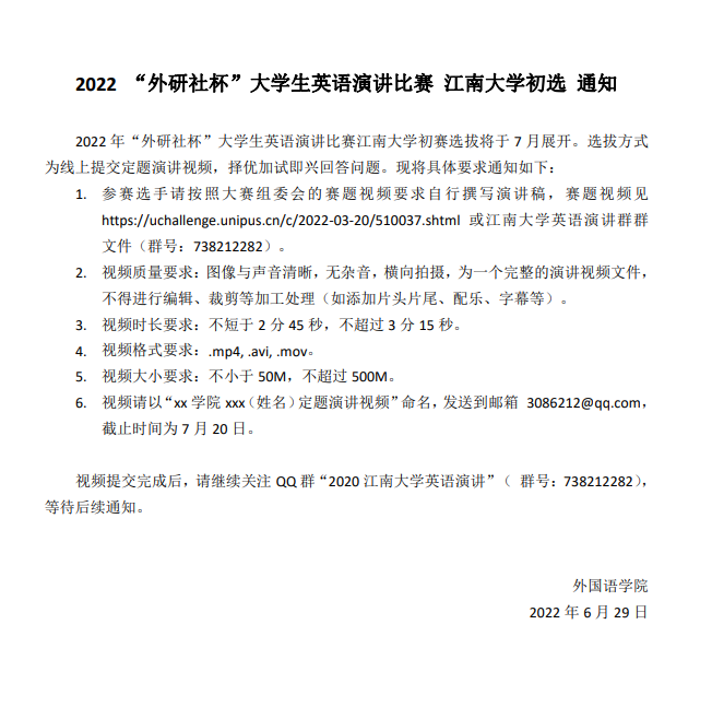 2022“外研社杯”大学生英语演讲比赛91社区 初选通知