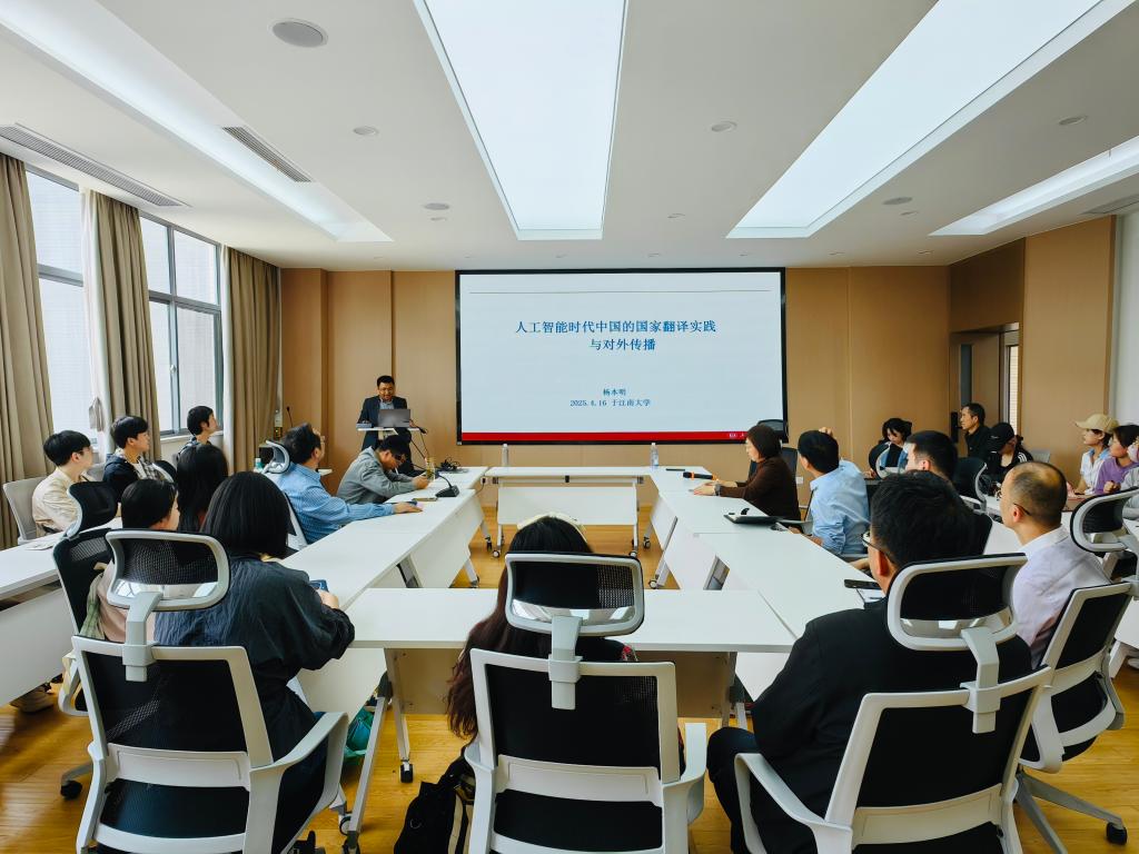 作了一场题为“人工智能时代中国的国家翻译实践与对外传播”的学术讲座。讲座由学院院长方文开主持,学院师生70余人参加了讲座。